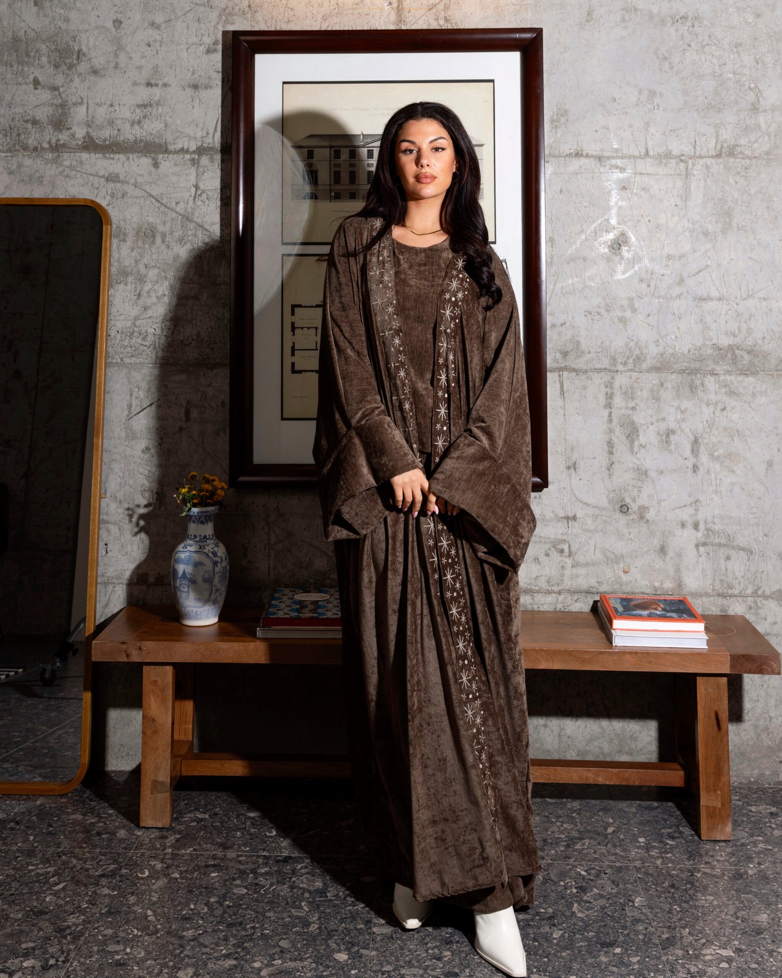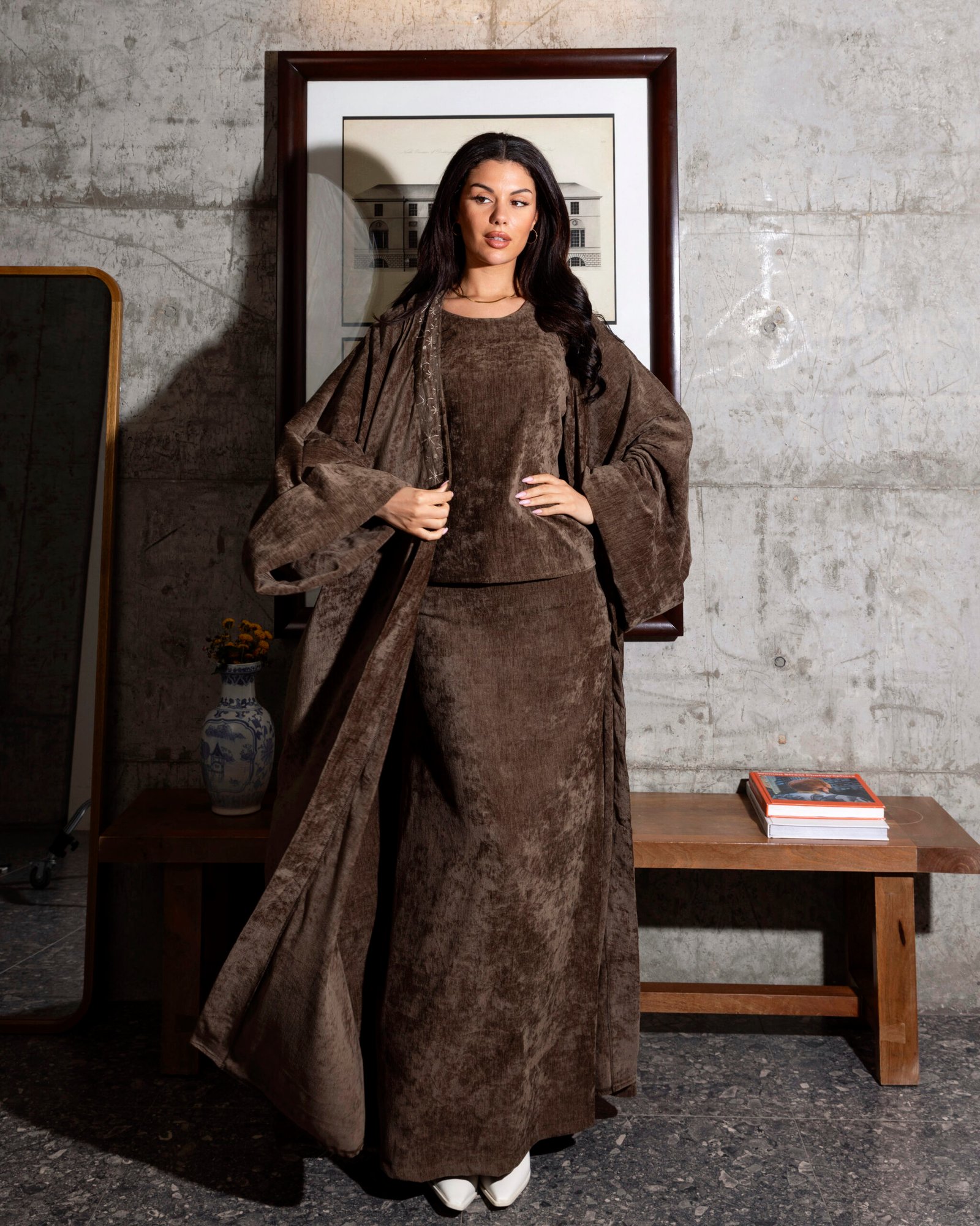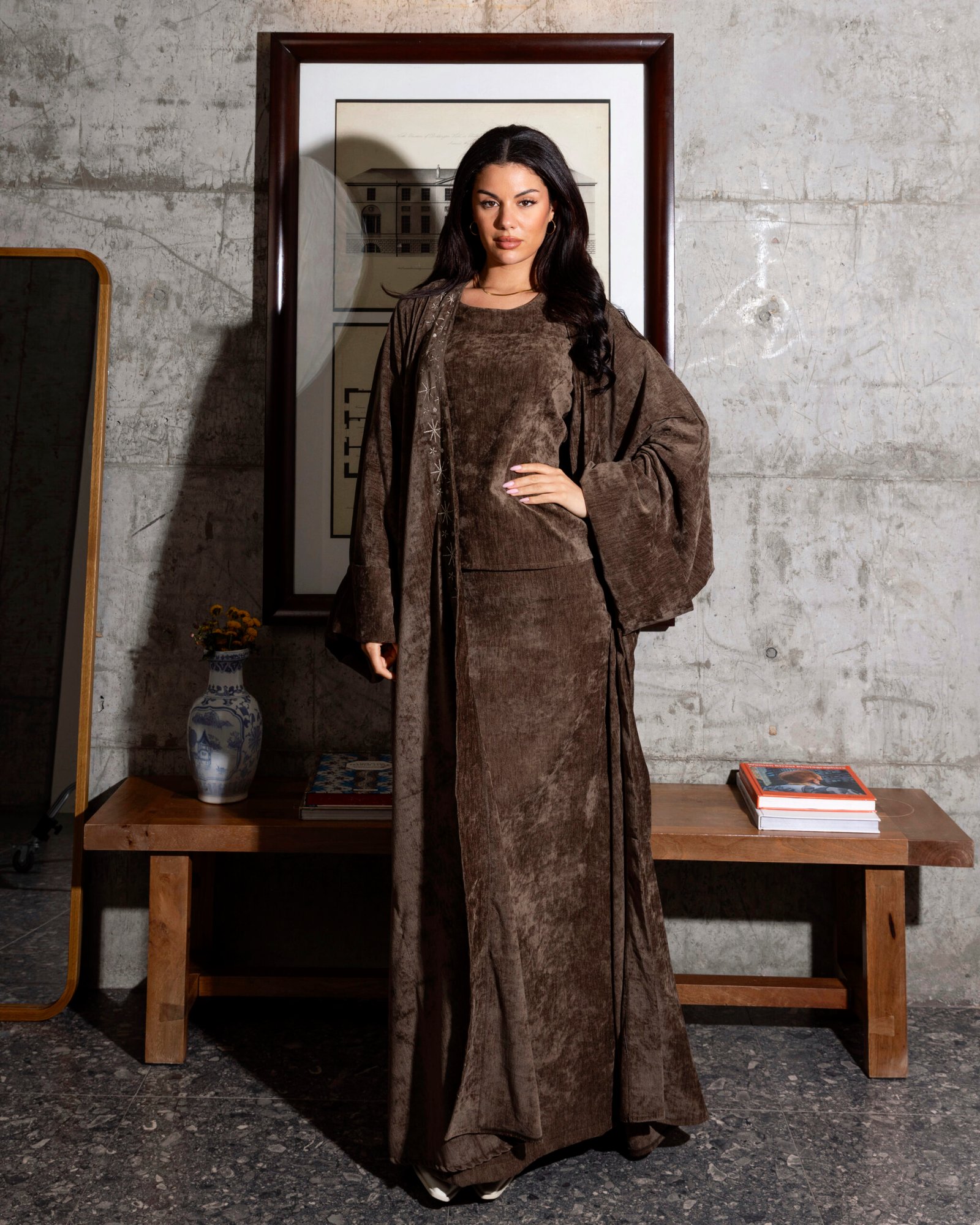 A luxurious three-piece velvet kaftan featuring a skirt, top, and an embroidered bisht. Designed for effortless elegance, it combines rich texture with a comfortable fit—creating a gorgeous, elevated look that feels as beautiful as it looks.
