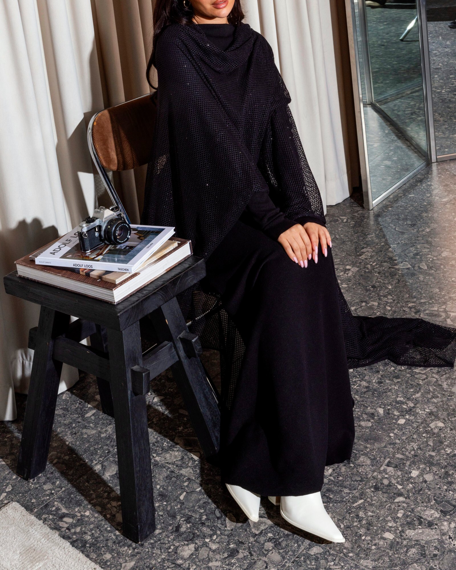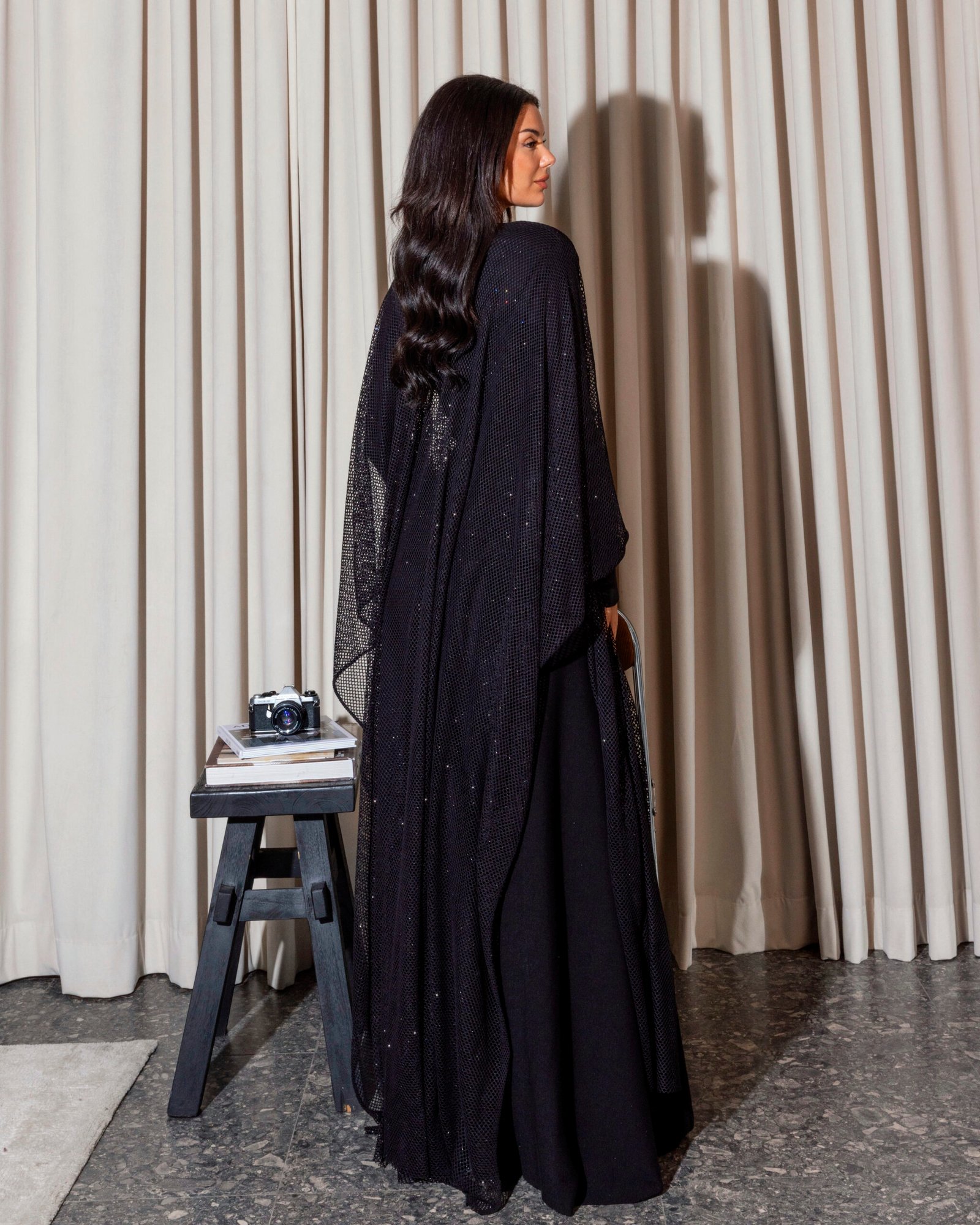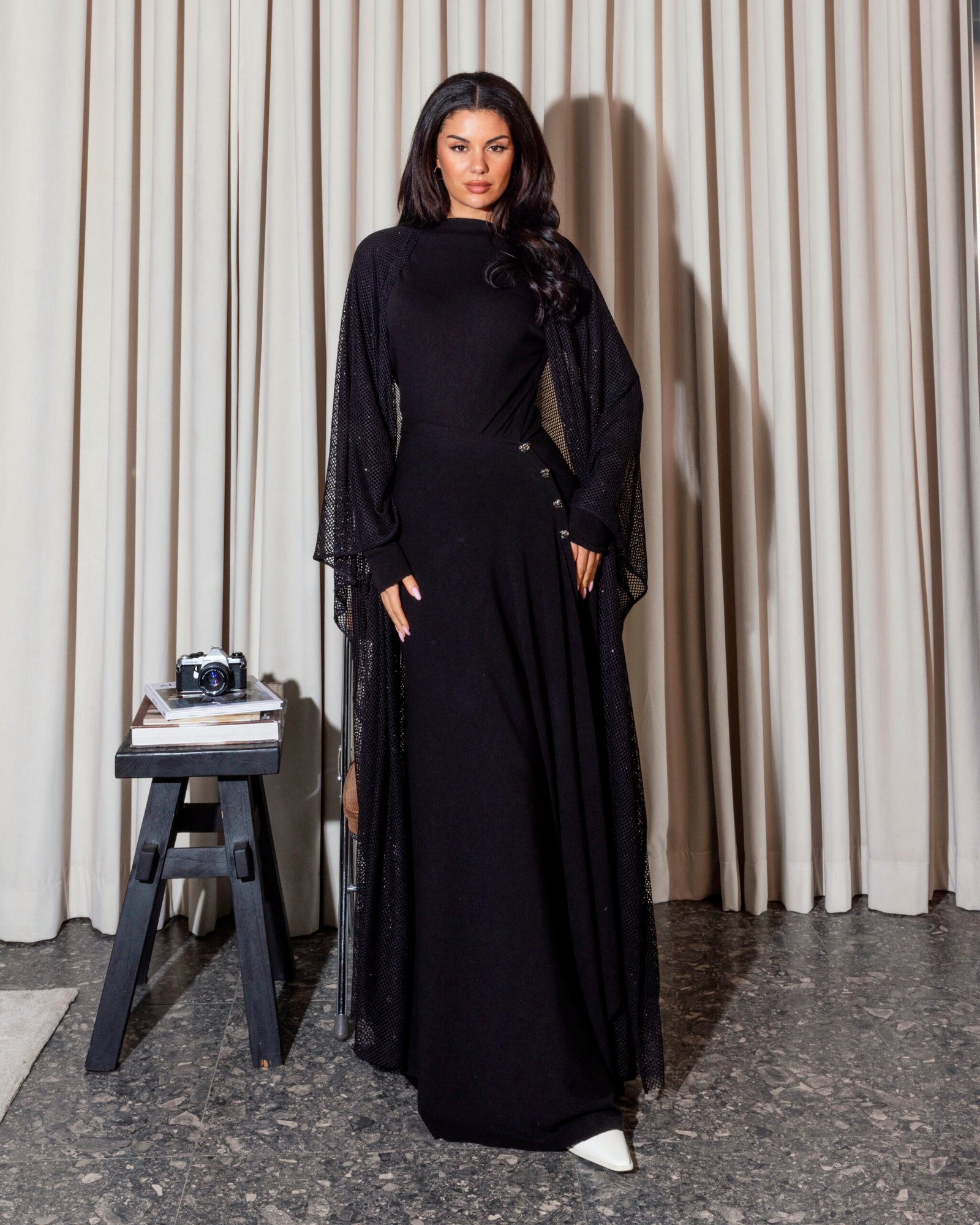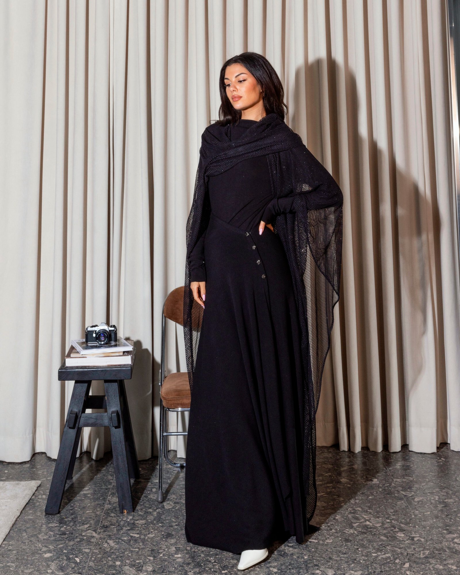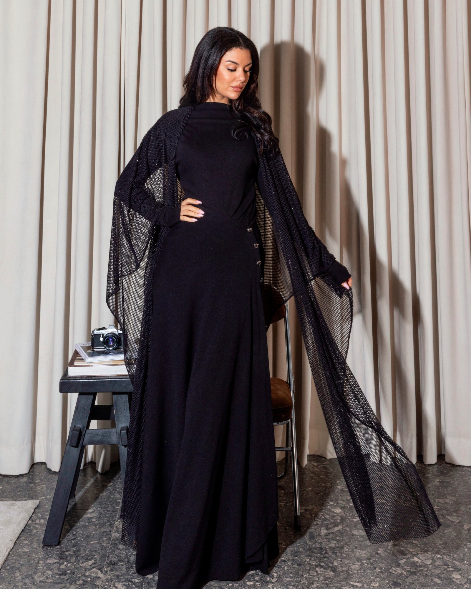 A soft black three-piece kaftan featuring a refined top and skirt, accented with delicate side buttons for subtle detail. Finished with a luxurious bisht-style scarf that drapes effortlessly and elevates the entire look—this piece is truly stunning and made to leave a lasting impression.